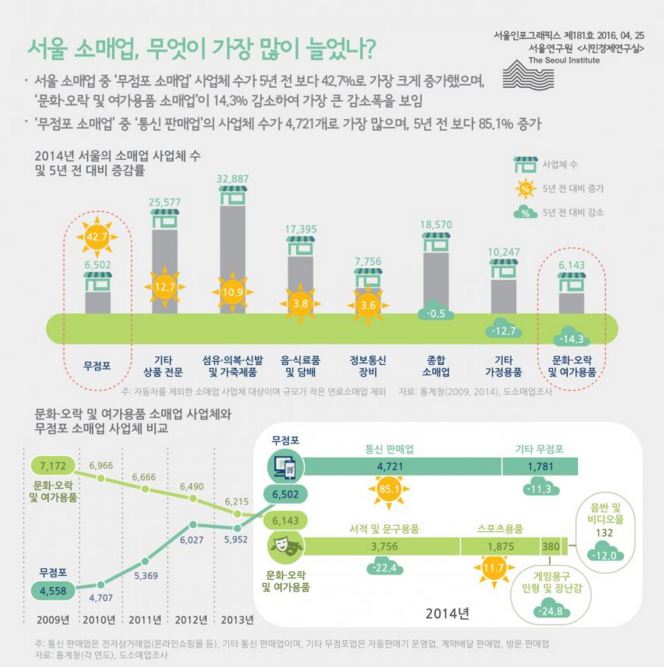 25일 서울연구원의 서울인포그래픽스에 따르면 2009년 이후 2014년까지 사업체 수가 가장 많이 증가한 소매업은 무점포 소매업(42.7%)으로 나타났다.