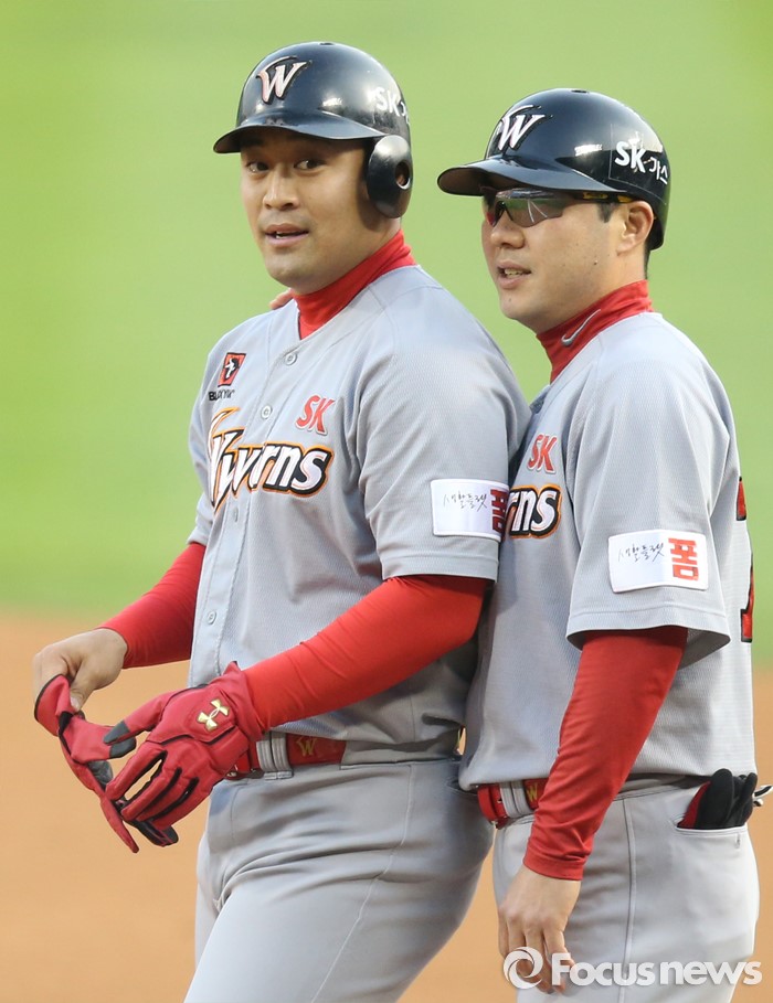 (서울=포커스뉴스) 28일 서울 잠실구장에서 열린 2016 프로야구 SK-두산 경기 1회초 2사 2루에서 SK 정의윤이 1루수 맞고 굴절된 적시 안타를 치고 1루에서 박진만 코치와 얘기하고 있다.