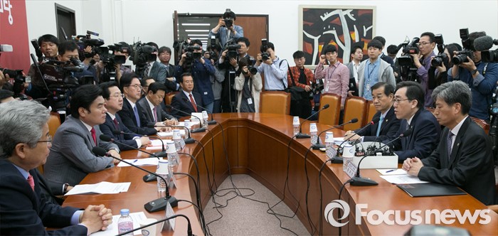(서울=포커스뉴스) 원유철(왼쪽 두번째) 새누리당 대표최고위원 권한대행을 비롯한 의원들이 28일 오전 서울 여의도 국회에서 열린 대북 관련 긴급 안보 대책회에 참석해, 조태열(오른쪽 두번째) 외교부 2차관의 발언을 경청하고 있다.