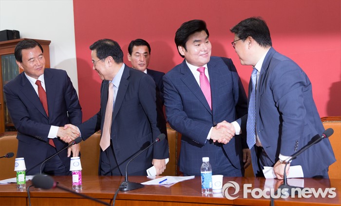 (서울=포커스뉴스) 원유철(오른쪽 두번째) 새누리당 대표최고위원 권한대행과 조원진 원내수석부대표가 2일 오전 서울 여의도 국회에서 열린 마지막 원내대책회의를 마친 뒤, 인사하고 있다.