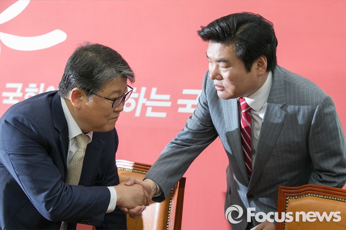 (서울=포커스뉴스) 원유철(오른쪽) 새누리당 원내대표와 조원진 원내수석부대표가 25일 오전 서울 여의도 국회에서 열린 상임위원장 · 간사단 연석회의에 참석해 악수하고 있다.