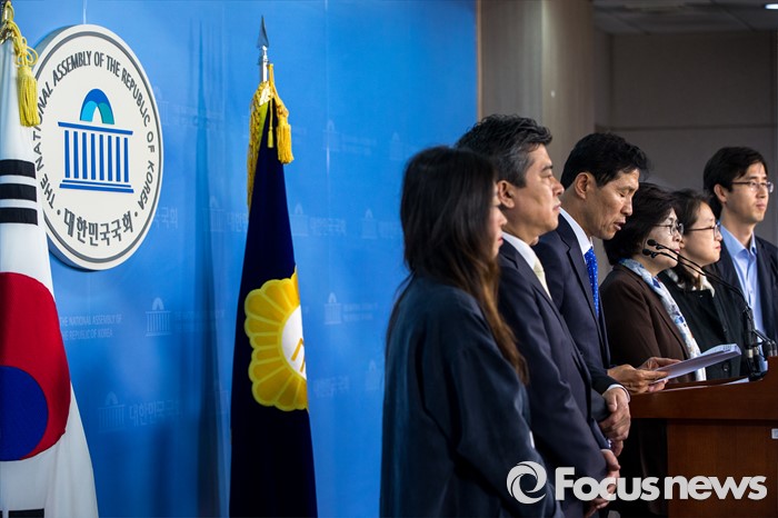 (서울=포커스뉴스) 이학영(왼쪽 세번째) 더불어민주당 의원이 2일 오전 서울 여의도 국회에서 테러방지법 시행 관련 기자회견을 하고 있다.