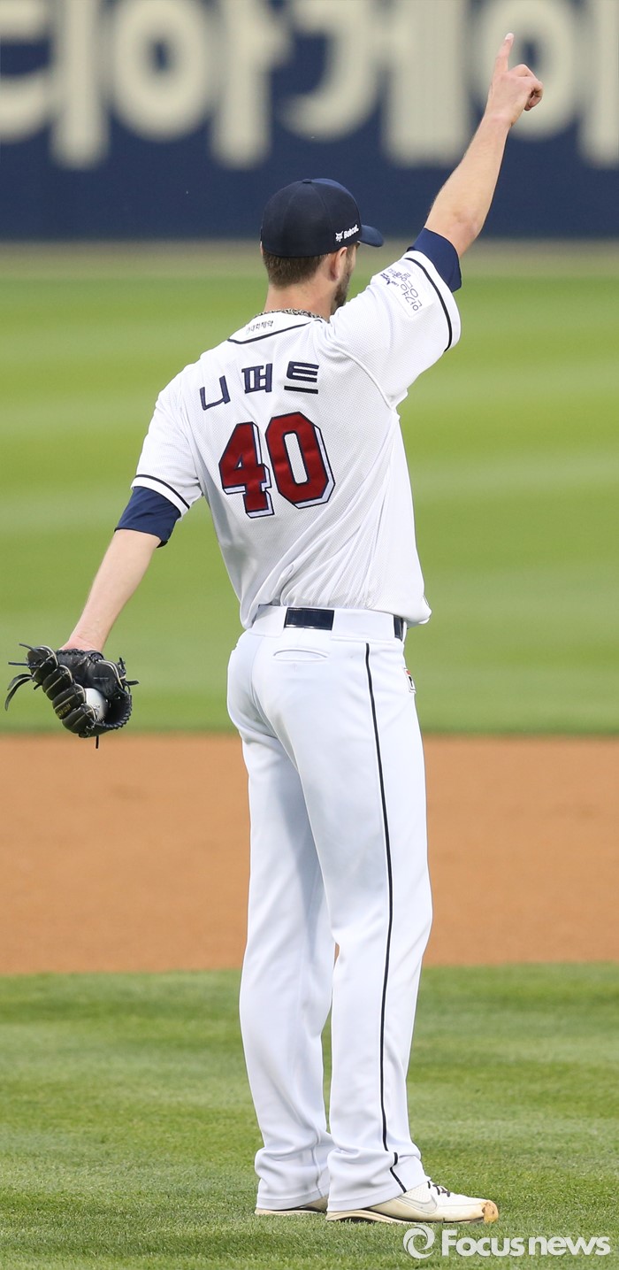 (서울=포커스뉴스) 26일 서울 잠실구장에서 열린 2016 프로야구 SK-두산 경기에서 1회초 두산 선발투수 니퍼트가 SK 최정의 타구를 펜스에 부딪치며 잡은 중견수 정수빈을 향해 오른손 검지를 치켜들며 격려의 사인을 보내고 있다.