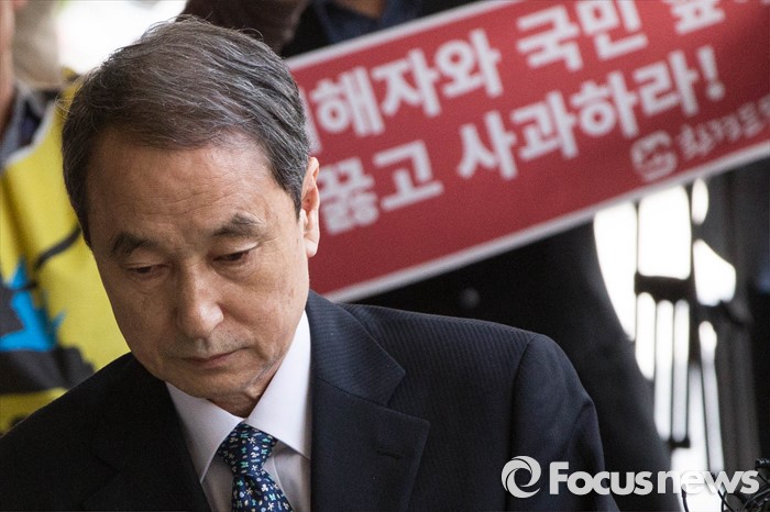 (서울=포커스뉴스) 가습기 살균제 과실 책임을 받고 있는 신현우 전 옥시 대표가 피의자 신분으로 26일 오전 서울 서초구 서울중앙지방검찰청에 출두하고 있다.