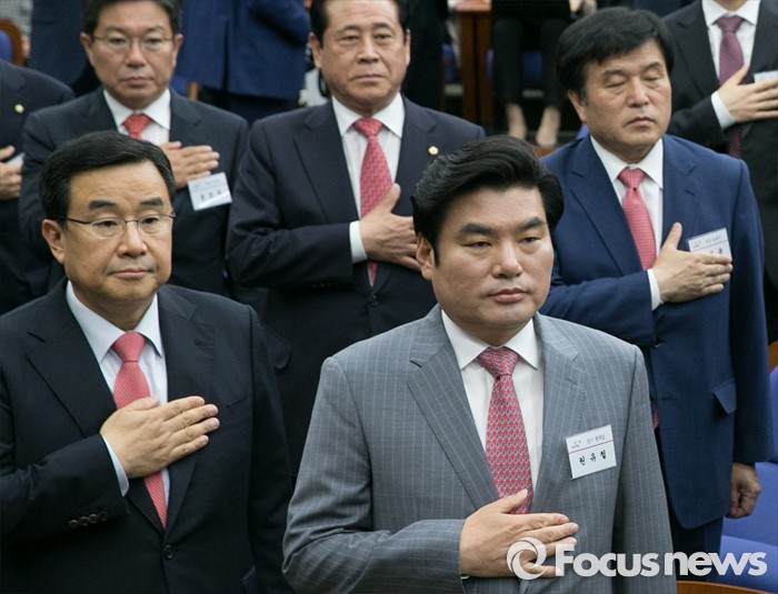 (서울=포커스뉴스) 원유철(앞줄 오른쪽) 새누리당 원내대표를 비롯한 제20대 총선 당선자들이 26일 오전 서울 여의도 국회에서 열린 당선자 워크숍에 참석해 국민의례를 하고 있다.