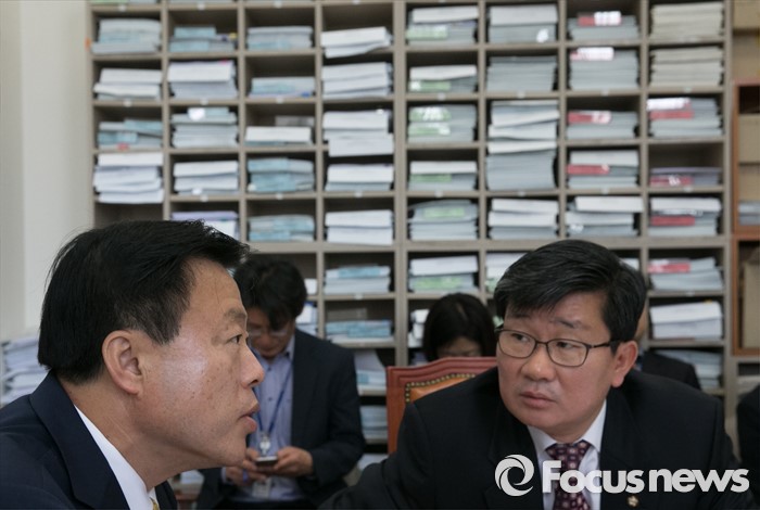 (서울=포커스뉴스) 26일 오전 서울 여의도 국회에서 열린 법제사법위원회 법안심사1소위원회에 참석한 이한성(왼쪽) 소위원장과 전해철 야당 간사가 대화하고 있다.