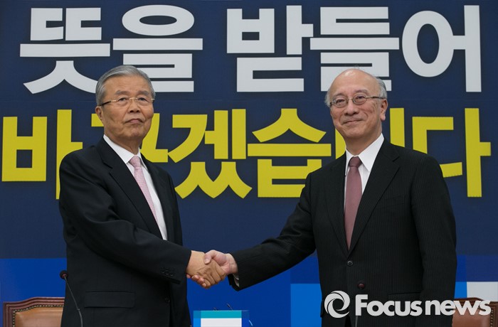 (서울=포커스뉴스) 김종인(왼쪽) 더불어민주당 비대위 대표가 26일 오후 서울 여의도 국회를 방문한 벳쇼 코로 주한일본대사와 만나 환담에 앞서 악수하고 있다.