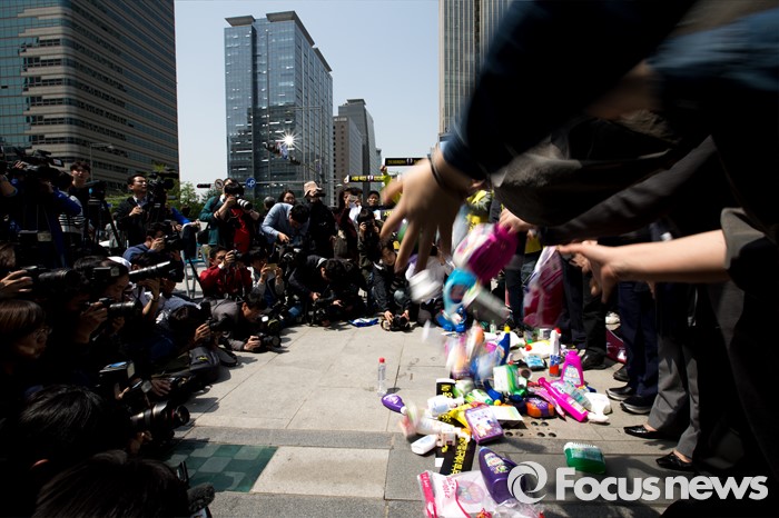 (서울=포커스뉴스) 25일 오전 서울 종로구 광화문 광장에서 옥시 가습기 살균제 피해 가족 및 환경단체 관계자들이 옥시 상품 불매를 촉구하는 퍼포먼스를 펼치고 있다.