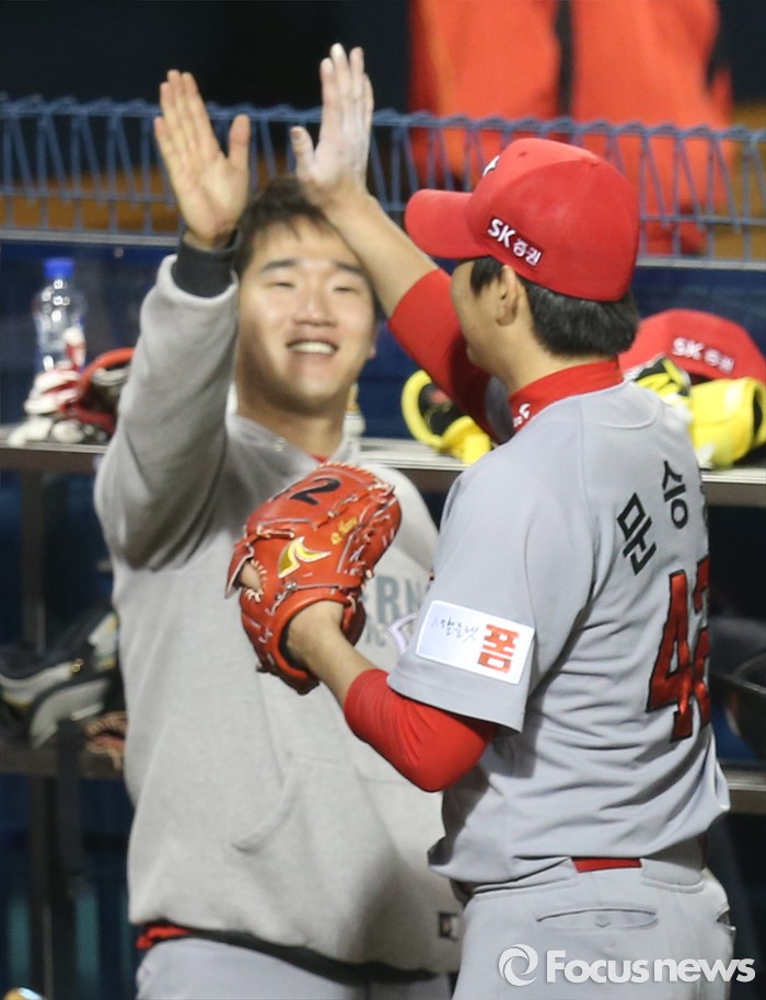 (서울=포커스뉴스) 28일 서울 잠실구장에서 열린 2016 프로야구 SK-두산 경기에서 5회까지 무실점으로 두산 타선을 잘 봉쇄한 SK 투수 문승원을 덕아웃의 박종훈이 하이파이브하며 환영하고 있다.