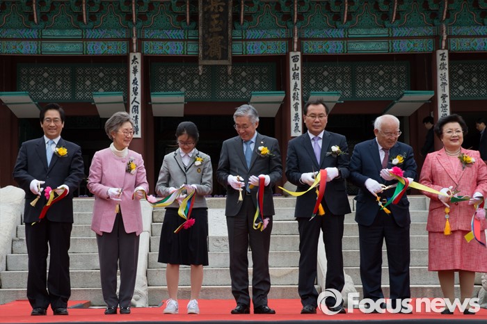 (서울=포커스뉴스) 27일 오후 서울 종로구 경복궁 집옥재에서 열린 궁궐 속 작은도서관 집옥재 개관행사에 김종덕(왼쪽 네번째) 문화체육관광부 장관과 주요인사들이 테이프커팅을 하고 있다.
