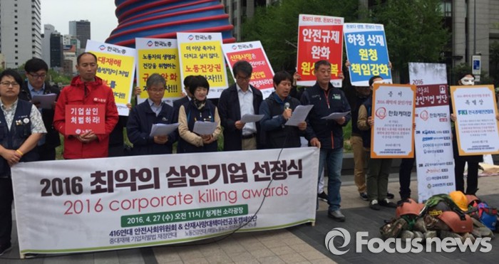 (서울=포커스뉴스) 노동계가 27일 '2016 최악의 살인기업' 9곳을 선정해 발표했다.