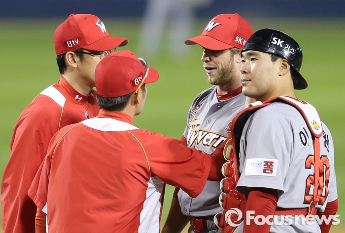 (서울=포커스뉴스) 26일 서울 잠실구장에서 열린 2016 프로야구 SK-두산 경기 6회말 무사 1,2루에서 SK 김원형 투수 코치(왼쪽 두번째)가 마운드에 올라가 투수 켈리와 얘기하고 있다.