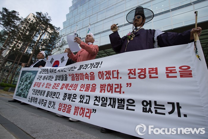 (서울=포커스뉴스) 26일 오후 서울 영등포구 전경련회관 앞에서 애국국민운동대연합 회원들이 어버이연합 억대 금품지원 규탄 기자회견을 하고 있다.