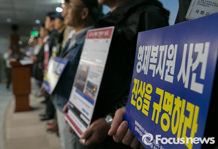 (서울=포커스뉴스) 진선미 더불어민주당 의원과 형제복지원 사건 피해생존자, 실종자, 유가족모임 등이 27일 오전 서울 여의도 국회 정론관에서 형제복지원 특별법 제정 촉구 기자회견을 하고 있다.