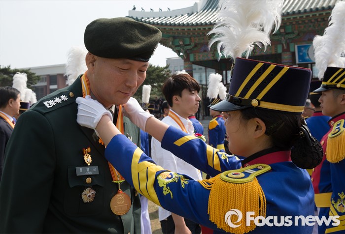 (서울=포커스뉴스) 29일 오후 서울 노원구 육군사관학교에서 열린 개교 70주년 기념식에서 한 생도가 아름다운 육사인 70인에 선정된 선배 군인에게 메달을 전달하고 있다.