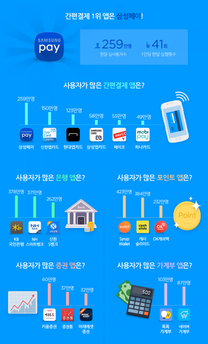 모바일 트렌드 조사업체 와이즈앱이 지난 3월 한달 동안 전국 1만1524명의 안드로이드 스마트폰 사용자를 대상으로 모바일 금융앱 사용행태를 조사한 결과, 삼성전자의 모바일 간편결제 솔루션인 삼성페이가 실사용자수는 259만명을 기록해 국내 간편결제 앱 1위를 차지했다. 1인당 평균 실행횟수는 41회로 나타났다.