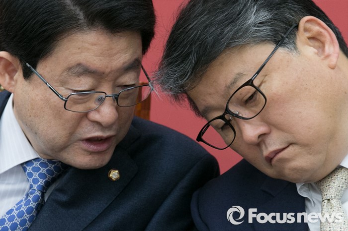 (서울=포커스뉴스) 정희수(왼쪽) 기재위원장과 조원진 새누리당 원내수석부대표가 25일 오전 서울 여의도 국회에서 열린 상임위원장 · 간사단 연석회의에 참석해, 대화하고 있다.