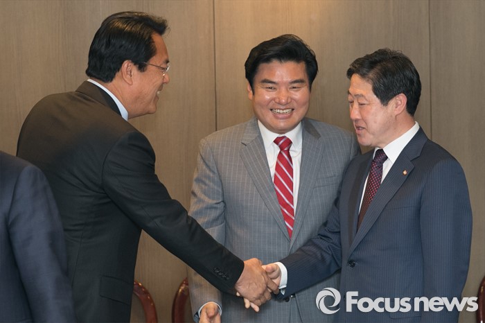 새누리당 원내대표 선거 등록은 오는 29일부터 시작돼 5월3일 경선을 통해 선출한다.원유철(가운데) 새누리당 원내대표가 25일 오후 서울 여의도의 한 중식당에서 열린 중진의원 오찬 간담회에 참석해, 유기준(오른쪽) 의원과 정진석 당선인이 악수하는 모습을 보고 있다. 2016.04.25 박철중 기자