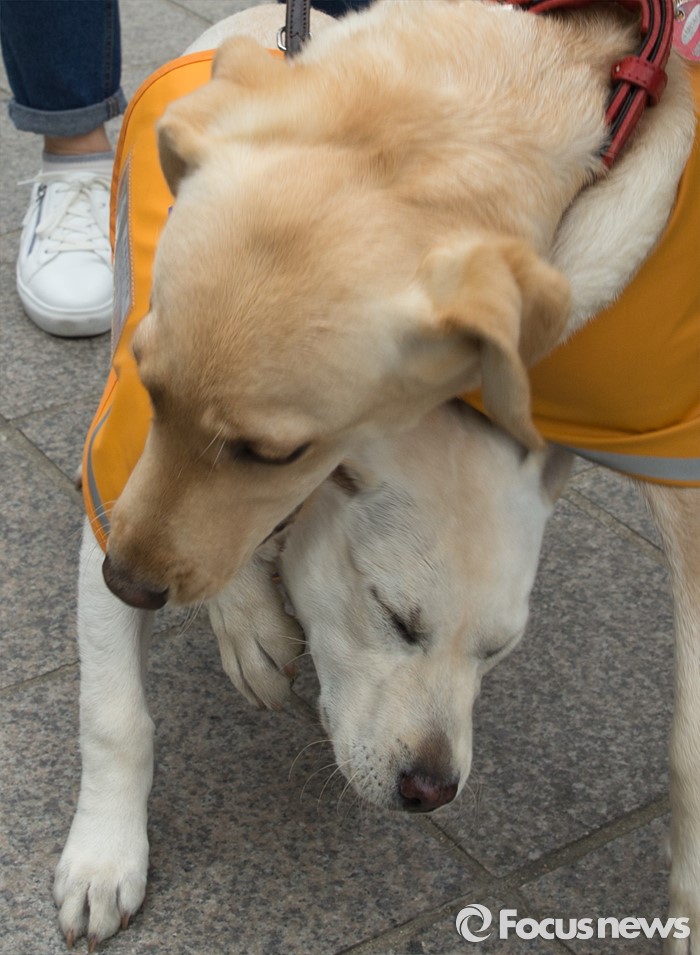 (서울=포커스뉴스) 27일 오전 서울 청계천에서 삼성화재안내견학교 훈련사들과 안내견들이 시민들과 함께 '안내견과의 만남' 행사를 하고 있다.