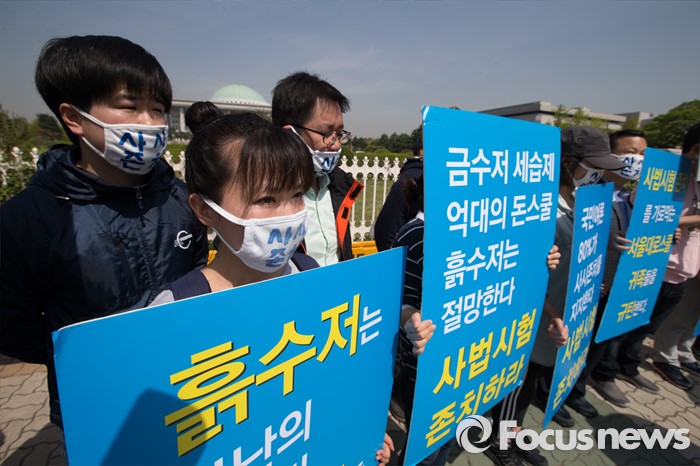 (서울=포커스뉴스) 26일 오전 서울 영등포구 국회의사당 앞에서 사법시험 준비 고시생들이 사법시범 존치를 촉구하고 있다.