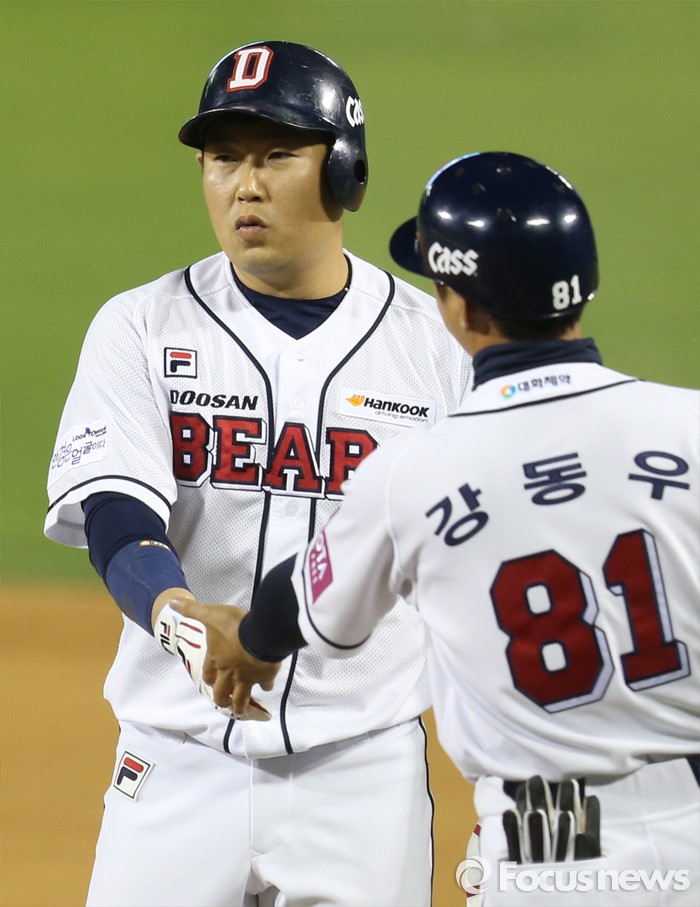 (서울=포커스뉴스) 28일 서울 잠실구장에서 열린 2016 프로야구 SK-두산 경기 6회말 1사 2,3루에서 두산 양의지가 동점 주자를 불러 들이는 좌익수 왼쪽으로 떨어지는 안타를 날리고 1루에서 강동우 코치의 축하를 받고 있다.