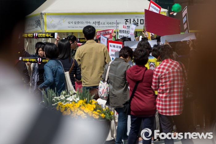 (서울=포커스뉴스) 25일 오전 서울 종로구 광화문 광장에서 옥시 가습기 살균제 피해 가족 및 환경단체 관계자들이 옥시 상품 불매를 촉구하는 기자회견을 하고 있다.