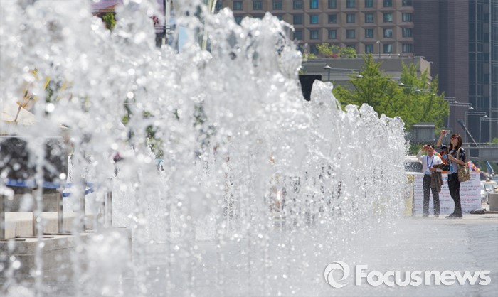 (서울=포커스뉴스) 서울 한낮 기온이 초여름 날씨를 보이는 26일 오후 광화문광장 바닥분수대를 찾은 외국인 관광객들이 즐거운 시간을 보내고 있다.