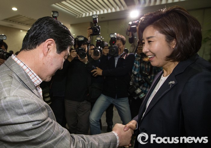 (서울=포커스뉴스) 새누리당 차기 원내대표 경선 후보등록 마감 예정일인 1일 오전 서울 여의도 국회 정론관 앞에서 차기 원내대표 후보군으로 거론되는 유기준(왼쪽), 나경원 의원이 악수하고 있다.