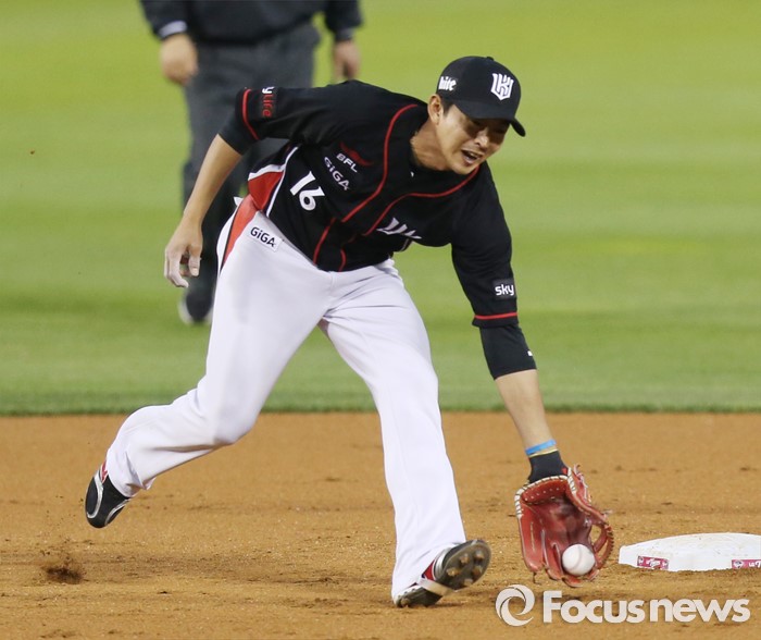 (서울=포커스뉴스) 29일 서울 잠실구장에서 열린 2016 프로야구 kt-LG 경기 3회말 2사후 kt 유격수 박기혁이 LG 정성훈의 땅볼 타구를 잡고 있다.