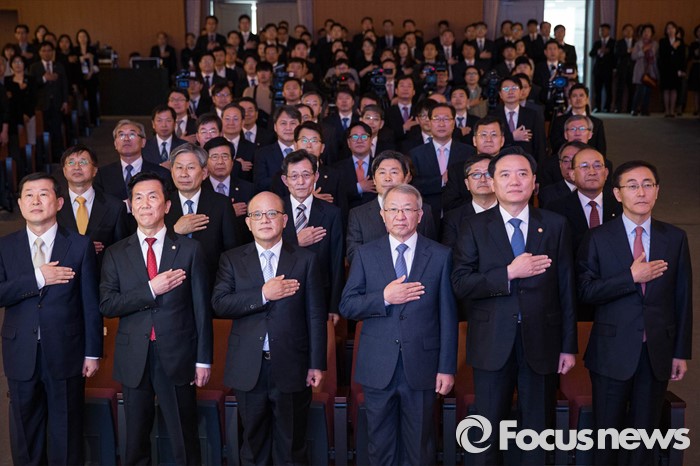 (서울=포커스뉴스) 25일 오전 서울 서초구 대검찰청에서 열린 제53회 법의날 기념식에서 참석자들이 국민의례를 하고 있다. 앞줄 왼쪽부터 이성호 국가인권위원장, 하창우 대한변호사협회장, 박한철 헌법재판소장, 양승태 대법원장, 김현웅 법무부장관, 김수남 검찰총장.