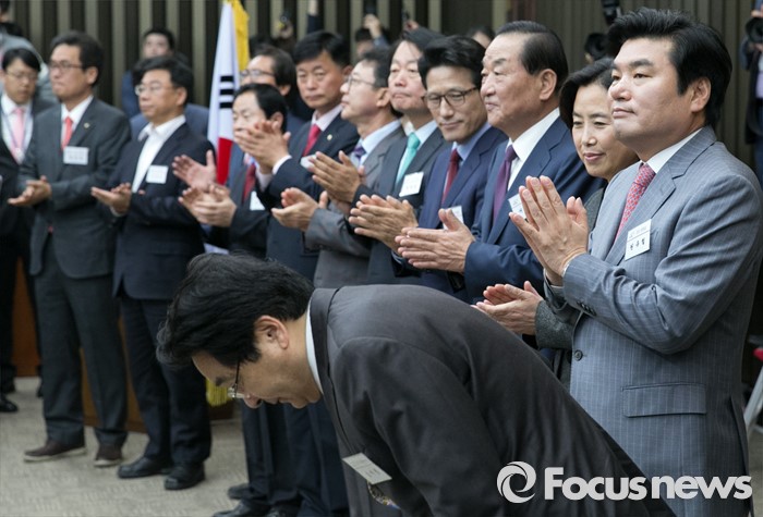 (서울=포커스뉴스) 26일 오전 서울 여의도 국회에서 열린 새누리당 20대 총선 당선자 워크숍에 참석한 원유철 원내대표 등 경기도 지역 당선인들이 인사하고 있다.