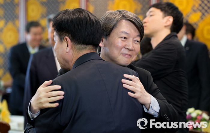 (서울=포커스뉴스) 안철수 국민의당 상임공동대표가 25일 오후 서울 영등포구의 한 중식당에서 제20대 국회의원 선거 서울지역 출마자들과 오찬간담회에 앞서 포옹을 하고 있다.
