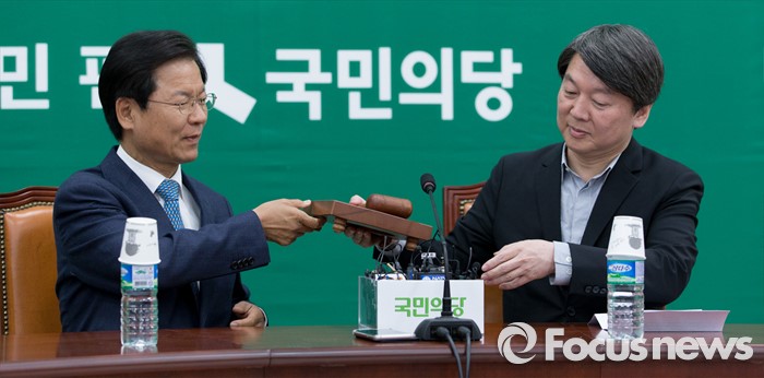 (서울=포커스뉴스) 안철수(오른쪽) 국민의당 상임공동대표가 25일 오전 서울 여의도 국회에서 최고위원회의에 참석해 천정배 공동대표로부터 의사봉을 전달 받고 있다.