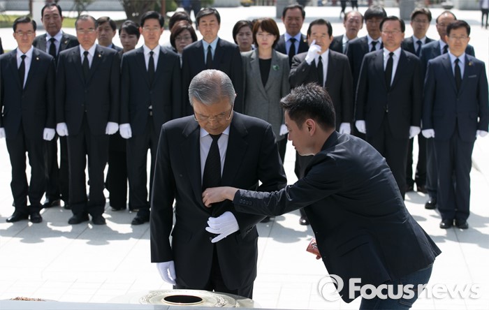 (광주=포커스뉴스) 김종인 더불어민주당 비대위 대표가 25일 오전 광주 북구 국립 5·18민주묘지를 방문해 20대 총선 당선인 및 광주·전남지역 낙선 인사들과 참배에 앞서 넥타이를 고쳐매고 있다.