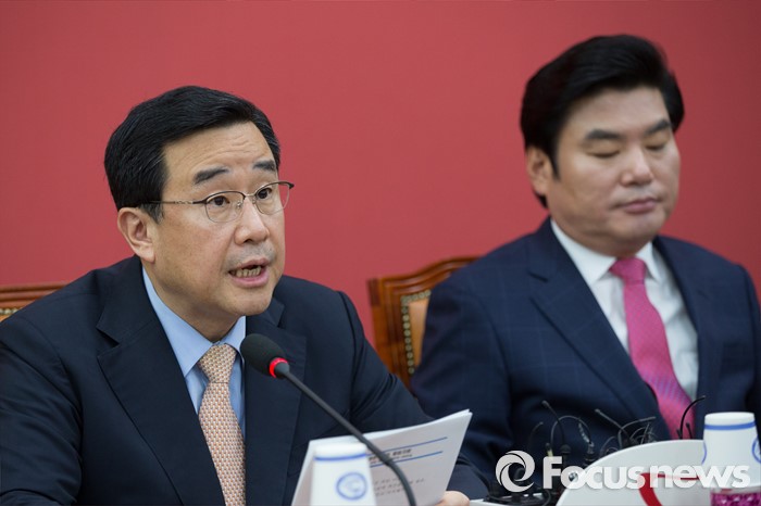 (서울=포커스뉴스) 김정훈(왼쪽) 새누리당 정책위의장이 2일 오전 서울 여의도 국회에서 열린 마지막 원내대책회의에 참석해, 발언하고 있다.