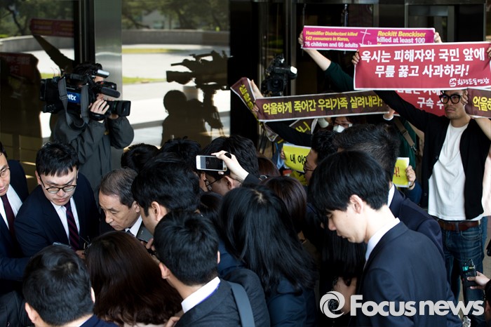 (서울=포커스뉴스) 수 많은 목숨을 앗아간 가습기 살균제가 만들어졌을 당시 옥시 최고경영자를 지낸 신현우 전 옥시 대표가 26일 오전 서울 서초구 서울중앙지검에 피의자 신분으로 출석 하며 취재진에게 질문을 받고 있다.