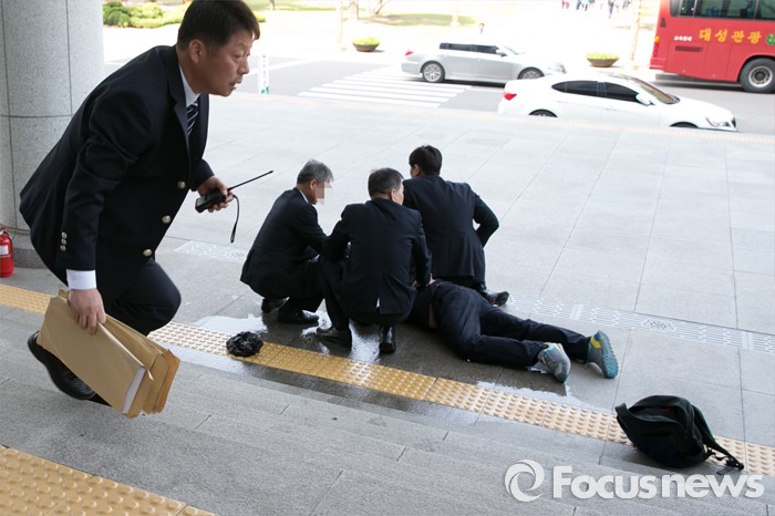 (서울=포커스뉴스) 25일 오후 서울 여의도 국회 의원회관 앞에서 신원 미상의 한 중년 남성이 분신 시도를 하려다, 국회 방호원들에게 제압당하고 있다.