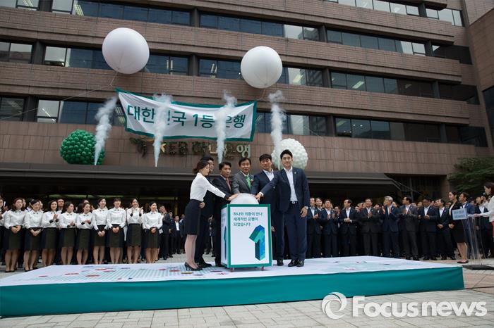 하나은행 노조 측은 '성과보상'이라는 명목으로 개별 조합원에게 화장품을 지급하는 등의 행태도 옳지 않다고 지적했다. 노조 측은 "2015년 임금 협상이 마무리되지 않은 상태에서 노조와의 협의 없이 임금성 현물을 개별 조합원들에게 지급하는 것은 위법 행위"라고 말했다.(서울=포커스뉴스) 1일 오전 서울 중구 을지로 KEB하나은행 본점에서 함영주 KEB하나은행장과 김정태 하나금융그룹회장을 비롯한 관계자들이 통합은행 출범 현판식을 갖고 있다. 2015.09.01 김인철 기자