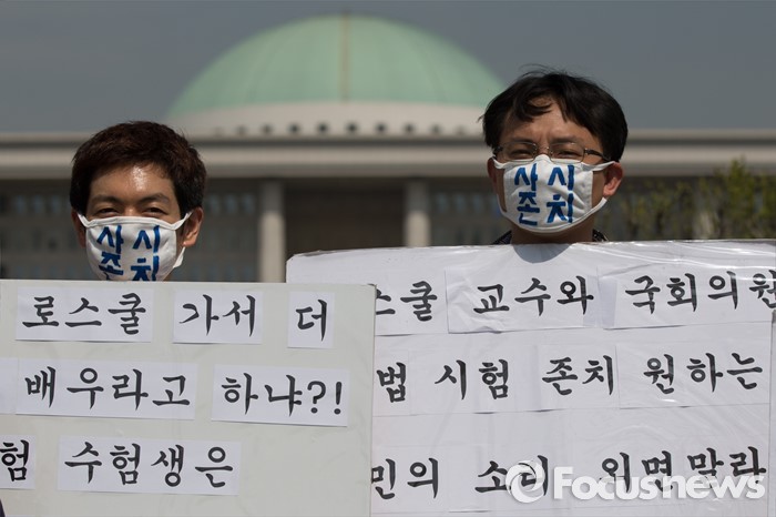 (서울=포커스뉴스) 26일 오전 서울 영등포구 국회의사당 앞에서 사법시험 준비 고시생들이 사법시범 존치를 촉구하고 있다.