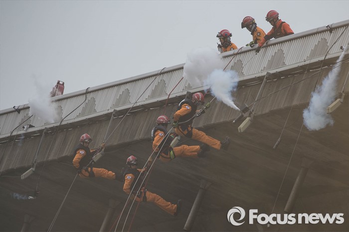 (서울=포커스뉴스) 27일 오전 서울 영등포구 여의도 한강공원 원효대교 일대에서 열린 '수도 서울 민․관․군 합동 대규모 복합재난 가상훈련'에 참가한 구조대원들이 레펠하강을 하고 있다.