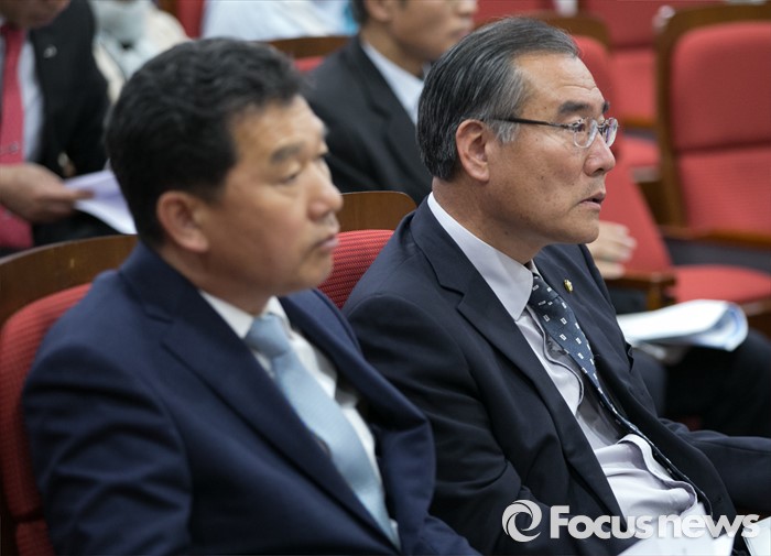 (서울=포커스뉴스) 28일 오후 서울 여의도 국회 의원회관에서 열린 더불어민주당의 호남 총선 평가 성찰과 대안 토론회에 참석한 신정훈(왼쪽), 이개호 의원이 토론회를 지켜보고 있다.