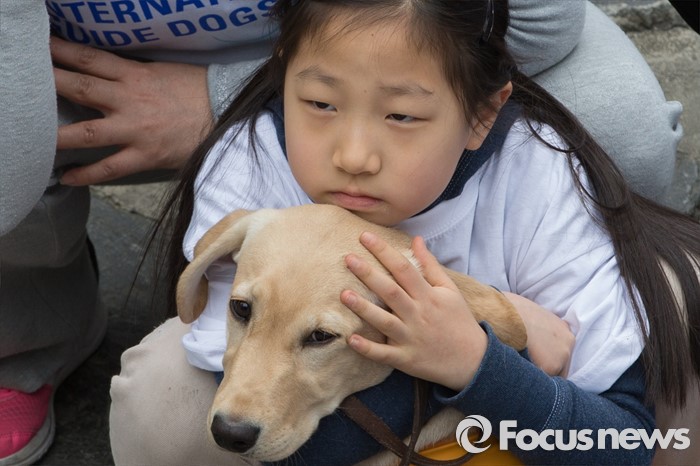 (서울=포커스뉴스) 27일 오전 서울 청계천에서 삼성화재안내견학교 훈련사들과 안내견들이 시민들과 함께 '안내견과의 만남' 행사를 하고 있다.