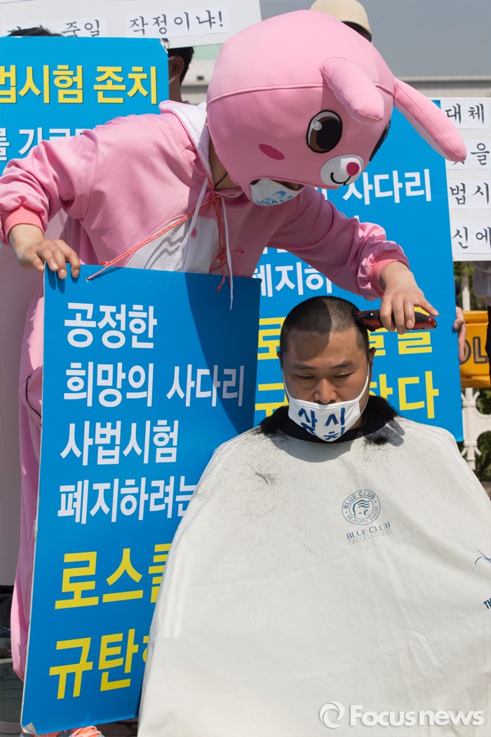 (서울=포커스뉴스) 26일 오전 서울 영등포구 국회의사당 앞에서 사법시험 준비 고시생 이종배씨가 사법시범 존치를 촉구하며 삭발을 하고 있다.