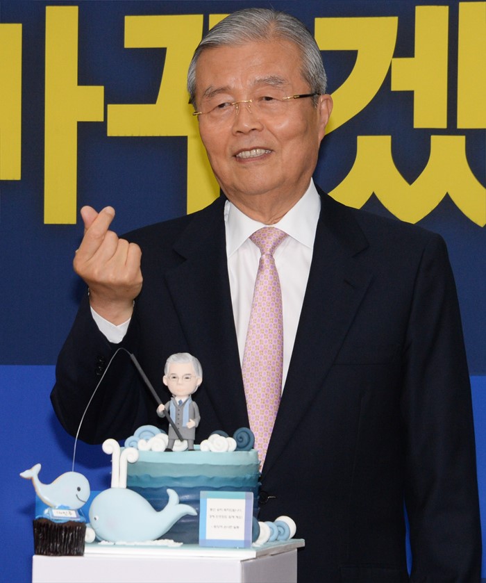 (서울=포커스뉴스) 김종인 더불어민주당 비대위 대표가 26일 오후 서울 여의도 국회에서 김 대표의 팬클럽 '트잉여 손녀팬' 소속 회원들에게 선물받은 케이크와 함께 포즈를 취하고 있다. <사진제공=더불어민주당>