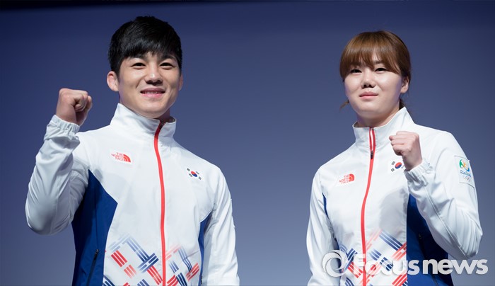 (서울=포커스뉴스) 27일 오후 서울 노원구 태릉선수촌에서 열린 제31회 리우하계올림픽대회 D-100일 미디어데이에서 레슬링 국가대표 김현우(왼쪽)와 핸드볼 국가대표 김온아가 리우올림픽 선수단 단복을 선보이고 있다.