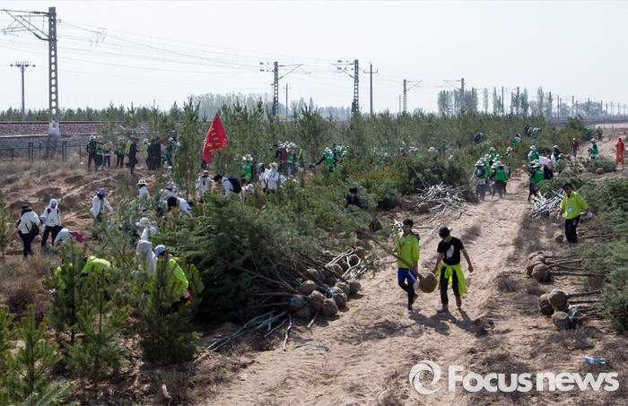 (다라더치/중국=포커스뉴스) 25일 오전 중국 내몽고 다라더치 쿠부치사막에서 2016 미래숲 15기 녹색봉사단원들이 나무 심기 작업을 하고 있다. 미래숲 녹색봉사단은 이번 봉사활동을 통해 황폐화된 사막에 나무 심기 및 각국 청년들과 우호를 증진을 위한 교류 활동을 전개했다.