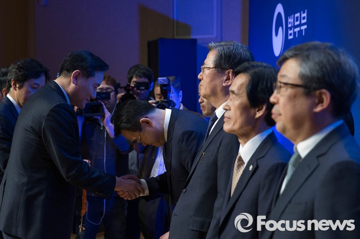 (서울=포커스뉴스) 김현웅(왼쪽) 법무부장관이 25일 오전 서울 서초구 대검찰청에서 열린 제53회 법의날 기념식에서 법질서확립 유공자들에게 포상을하고 있다.