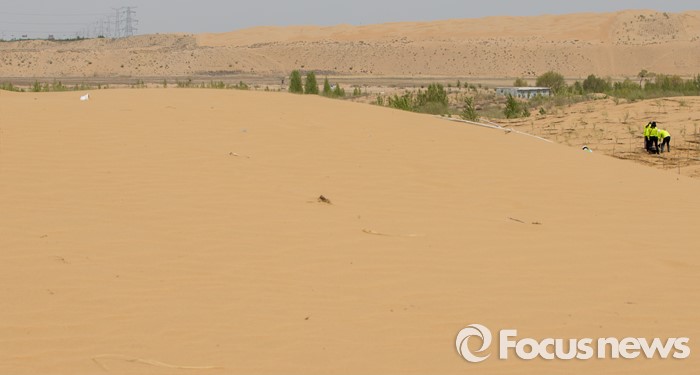 (다라더치/중국=포커스뉴스) 25일 오후 중국 내몽고 다라더치 쿠부치사막에서 2016 미래숲 15기 녹색봉사단원들이 나무 심기 작업을 하고 있다. 미래숲 녹색봉사단은 이번 봉사활동을 통해 황폐화된 사막에 나무 심기 및 각국 청년들과 우호를 증진을 위한 교류 활동을 전개했다.