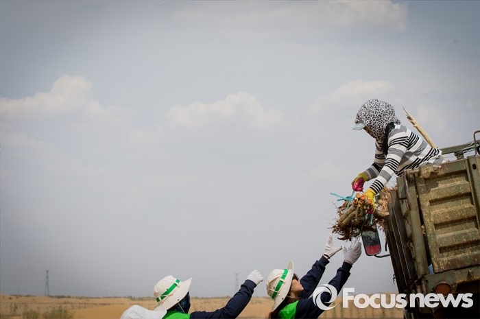 (다라더치/중국=포커스뉴스) 25일 오후 중국 내몽고 다라더치 쿠부치사막에서 2016 미래숲 15기 녹색봉사단원들이 나무 심기 작업을 하고 있다. 미래숲 녹색봉사단은 이번 봉사활동을 통해 황폐화된 사막에 나무 심기 및 각국 청년들과 우호를 증진을 위한 교류 활동을 전개했다.