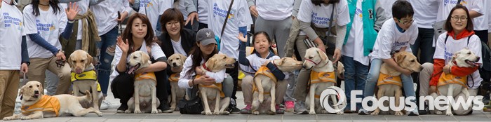 (서울=포커스뉴스) 27일 오전 서울 청계천에서 삼성화재안내견학교 훈련사들과 안내견들이 시민들과 함께 '안내견과의 만남' 행사를 하고 있다.
